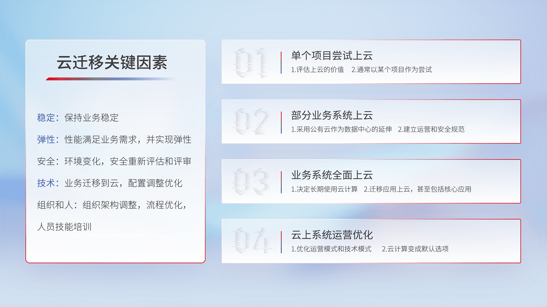 结合实际业务,,,从规划设计、、、云平台选型、、、云原生改造、、数据迁移、、集成交付,,,迁移全过程为客户识别最佳上云路径,,,,做好风险识别管理,,设计网络架构、、、身份权限、、、安全审计合规、、、、操作审计、、日志审计、、、监控告警策略、、、多站点容灾设计等,,,对云上基础设施进行整体规划,,,,提升IT治理水平,,以满足弹性、、、、高可用、、、高性能的需求。。。。