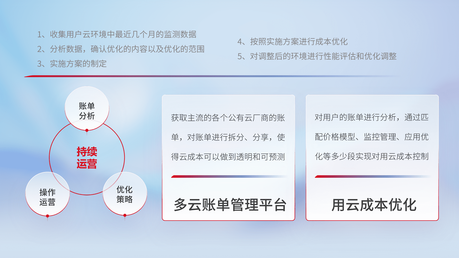 通过多云纳管,,,以统一的资源数据模型把客户的云资源进行抽象和封装,,,,进而实现对多云资源的统一操作,,保障云资源管理的可靠性、、、稳定性与可用性。。。量身定制化运维内容,,,配置、、、开发运维、、、补丁管理、、、备份、、监控、、认证和访问管理、、、、审计和日常巡检等,,,,保障在用云过程中的可靠度,,,,稳定度以及高可用率。。